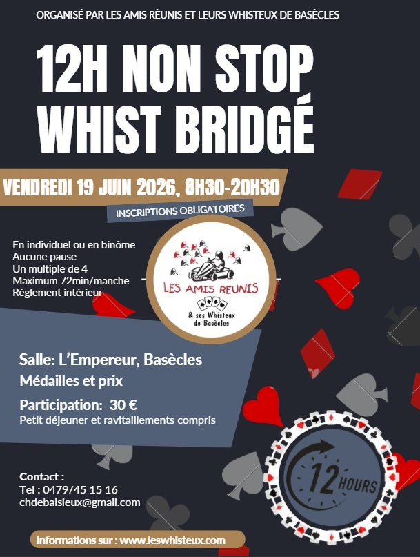- Vendredi 19 juin 2026 : 12H NON STOP WHIST BRIDGE à Basècles (Salle l'Empereur)