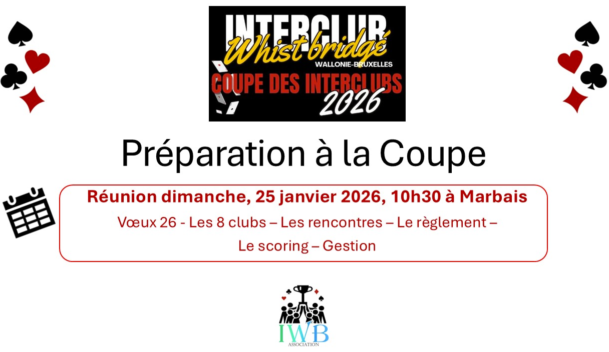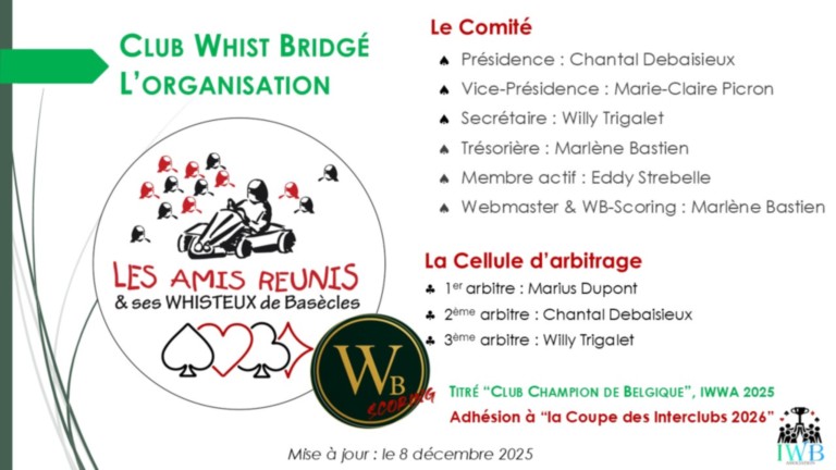 - Dimanche 11 octobre 2026 : Match éliminatoire de la COUPE DES INTERCLUBS 2026 avec les clubs "Whist Hélécine" (WHE), "Whist Les Loisirs" d'Alleur (ALL), "Whist Le Tilleul" d'Embourg (WTI) et "Les Whisteux de Basècles" (WDB) à Basècles (Salle l'Empereur)