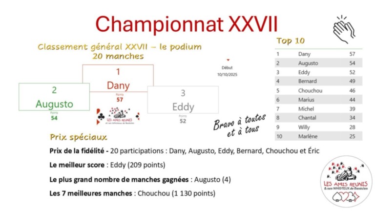 - Vendredi 16 janvier 2026 : REMISE DES VOEUX & REPAS FESTIF en clôture du CHAMPIONNAT XXVII